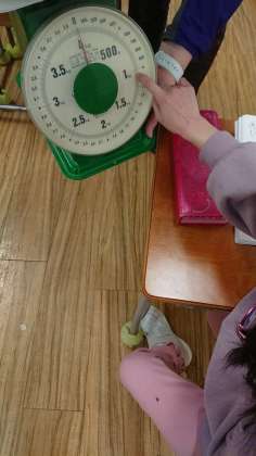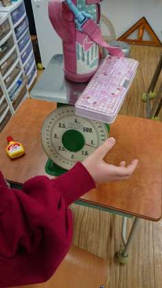ということで、大きなはかりで、1kgの重さを作りました。近い重さの物を予想して乗せ、後は小さいものを少しずつ乗せながら微調整。ぴったり1kgを作れたでしょうか。