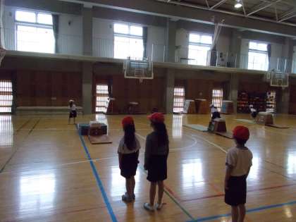 それから、跳び箱を使った運動遊びをしました。今日は、足開き跳び(開脚跳び)です。3段、4段、5段。両足での踏切、両手を赤い線に着く、おしりを前に移動させる、両足で着地することを練習しました。途中から、3段のところは着地するマットを厚みがあるものにしました。段差が減り、やわらかいので、思い切ってチャレンジできた子が増えました。