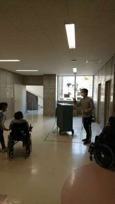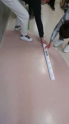 今日は、教室前の廊下の長さを測っているようです。1mものさしが何個分か、廊下の端から数えていました。3つのものさしを順に置いていき、少しずつ進んできました。地道な作業です。