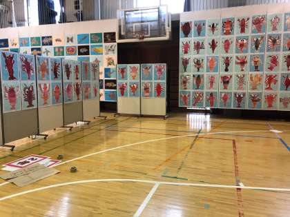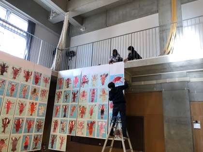 2/17 2年 展覧会に向けて その2 公開日 2021/02/17 更新日 2021/02/17 できごと いよいよ繋いだ作品を壁面に吊るす作業です。 個性豊かな130匹のザリガニがいきいきと動き出しました。 来週をお楽しみに。 いいね(0)