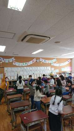 で、前の人の肩をトントンとたたき、何かのジェスチャーをしています。手を書くような仕草や走るような動作・・・ジェスチャー伝言ゲームです。何のスポーツか、一番後ろの子にはあるスポーツの写真が渡されています。前まで回って答え合わせです。皆で聞きます、ワン・ツー!