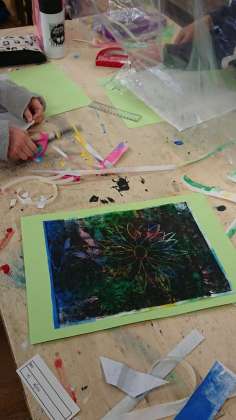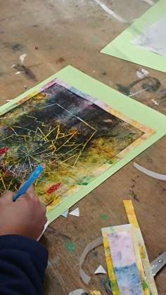 「バタフライ—」の写真がなくて、すみません。写真に写っている版画は、展覧会に出す作品ではありません。展覧会の準備が終わった子たちは、こちらの作品の仕上げや振り返りを行っていました。