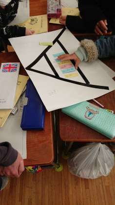 これから交流を実施していきます。今できるリモートの交流できることを考えていました。写真に写っている三角形の図は、思考ツールの1つ「ピラミッドチャート」です。出てきた意見を付箋で一番下の段に貼り、話し合いをしながら、まとめたり、削ったりしながら上の段に上げていきます。最後には1つに。たくさん出た考えを絞り込んでいくときに使います。考える内容によって、それに合った思考ツールがあります。これから、学習の中で様々経験していくと思います。