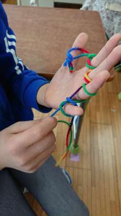 写真を見ていただくと分かりますが、ほうきや亀などいろいろなものができていました。「ゆびぬき」にも挑戦しているそうです。