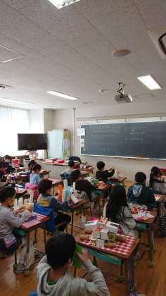 今日は、かざりやもようをつけて「ひとくふう」する時間です。「ひとくふう」は、「もっと」とか「もうすこし」ということです、と先生から説明がありました。紙を貼ったり、ペンで描いたりしてきれいに仕上げをします。