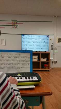 楽譜を見ながら弾いたり、音階で歌って覚えたりする練習をしていました。その中で、リズムをとるために、メトロノームが使われていました。カッチ、カッチと正しいリズムを刻んでいます。まずはゆっくりのリズムで練習していきます。テレビ画面に大きく映しだされているのがメトロノームです。