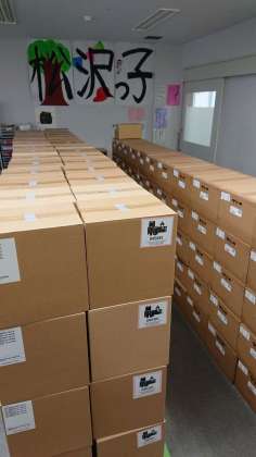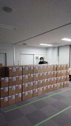 わりと長身の校長先生が胸まで隠れるほど箱が積まれています。本日、届きました。