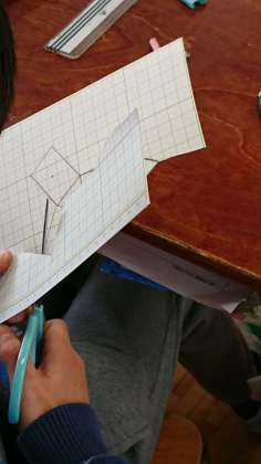 今日は、5年生が算数の「角柱と円柱」の学習で、方眼紙に展開図を描き、切って組み立て、立体を作っていました。