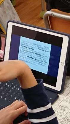 写真の大型テレビとタブレット型端末の画面をご覧ください。発表している児童は、発表の内容を前の大型画面に映し、聞く児童たちは自分お手元のタブレットで共有して発表を見ていました。とても見やすく、内容もしっかり伝わるなあと思いました。