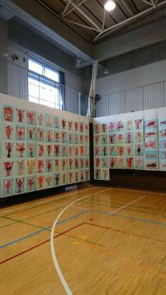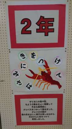 ザリガニの色や形、もようや動きをよく観察して大きな画用紙にクレパスをつかって描きました。クレパスの線が絵の具をはじく様子を楽しみながら、水かげんに気をつけて着色しました。