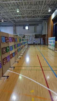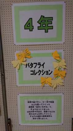 金網やブラシ、ビー玉や色墨などで描いてつくった「自分いろがみ」を使って、模様取りや形、大きさなどを工夫しながらチョウをつくりました。チョウの名前や採集場所は自分で考えました。
