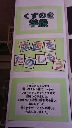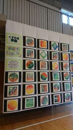 1年生から3年生は丸いスチレン板に、ヘラやフォークやフタでへこませて版をつくりました。4年生から6年生は彫刻刀を使い、版にしました。色もグラデーションの美しい作品になりました。