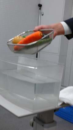 「水そうの水の中にピーマン、ニンジン、キュウリ、ナス、ジャガイモを入れます。これらの野菜は浮くでしょうか。沈むでしょうか。」