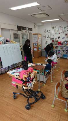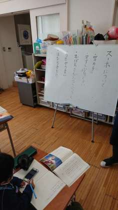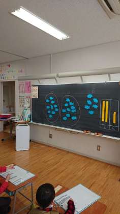 同じ授業を皆で受けるときもありますが、今日の2時間目は背中合わせに座って、1年生は算数、2年生は国語の学習をしていました。担任が、補助の先生と一緒に、両方の授業を同時に進めています。