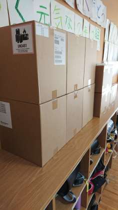 教室の後ろには、本日2年生から5年生に配付予定のタブレット型情報端末が置かれています。朝から、順次配付を進めています。