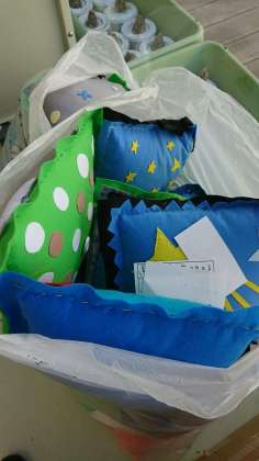各教室や廊下には、展覧会で飾っていた作品が戻ってきています。5年生のところにはクッションが届いていました。
