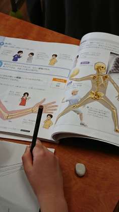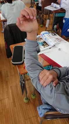 今日は、昨日も紹介した「筋肉」に加えて、「骨」「関節」についても学習していました。子供たちは、教科書の図を見ながら不思議そうに自分の体を触っています。きっと、普段何気なく動かしている腕や体のいろいろな部分の仕組みに驚くやら信じられないやらで頭では分かっていても、なかなか「そうなんだ。」と理解するのが難しいのかもしれません。不思議ですよね、確かに。