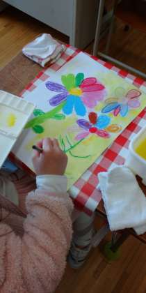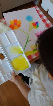 だんだんと仕上がってきたようで、今日は花のまわりに絵の具で色を塗っていました。