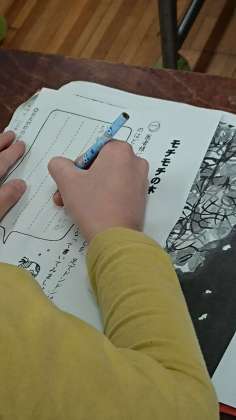 吹き出しに豆太の気持ちになって書いていました。文中、直接豆太の言葉としては書かれていませんが、それまでの出来事などから根拠を見つけて考えていました。