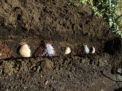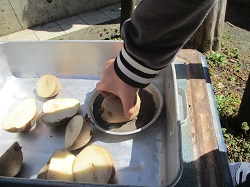 じゃがいもの芽が取れないように気を付けながら持って、土の中で腐らないように断面に灰を付けました。畑の中に置いたら、上からを土を被せ、