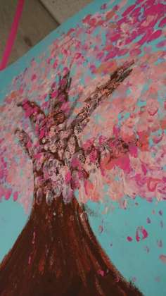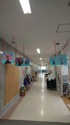 廊下に、図工で描いた作品でしょうか、ひも、いやリボンで(言葉は正確に)桜の絵がつるされています。少しずつずらしてつるしてあるので、奥の桜まで見いやすいです。飾り方がすてきで、いつもしばらく眺めてしまうきはだ学級の掲示物や展示された作品です。