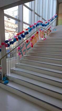体育館から戻るとき、階段に飾られた4年生からの贈り物の花がいくつか落ちているのに気が付きました。