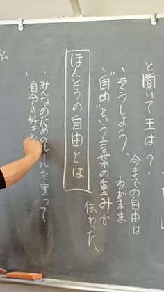 「うばわれた自由」というお話をもとに、考えていきます。決まりを守らず自由勝手に振舞っていた王子が国王になり国が乱れていくお話です。