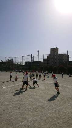 細かく分かれて、小さなコートを作ってゲームをしています。軟らかいボールで、飛距離もちょうど良いように調節されていて、たくさんの子の活躍が期待できるようになっています。途中、チームでコミュニケ—ションをとりながら守備をしたり、チームメイトの大きな当たりんに歓声を上げたりしながら楽しんでゲームをしていました。