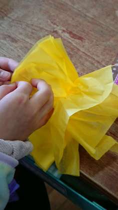 お花紙を数枚重ねて折り、真ん中を留めたものを開いていくときれいなお花の完成です。