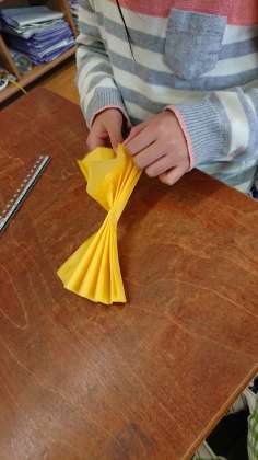 と、一口に言ってしまえば簡単そうですが、この作業は1年生にとっては大変難関です。まずは、紙を重ねるところで、薄くてふわふわと漂うお花紙に苦戦していました。そして蛇腹に折っていくのに再度苦戦。花開くのにまた苦戦・・・。