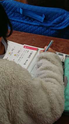 「おれ」の向き、画の長さなど、学んだことに気を付けながら、書いています。教科書には、「書き直そう」とあるので、二年生の間に書いた文字の復習なのでしょう。確認しながら丁寧に取り組んでいました。