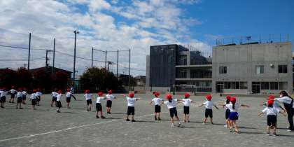 写真は1年生と2年生の体育の様子ですが、1年生は整列の練習のあとかけっこ、2年生は鬼ごっこをしていました。