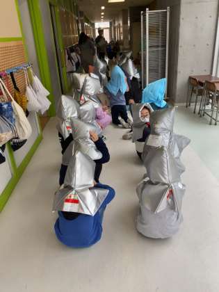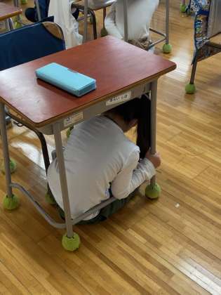 緊急放送がかかると、子供たちは素早く机の下にもぐり、静かに次の指示を待つことができました。次は放送の合図で避難です。子供たちは「お・か・し・も・ち」の約束をしっかり守って、廊下に避難することができました。