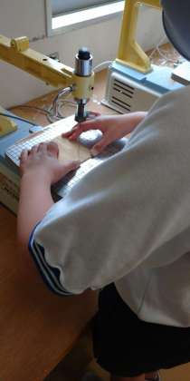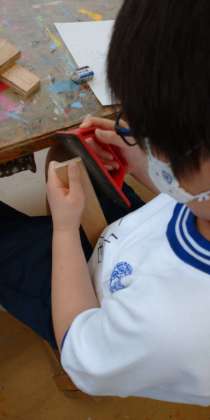 5年生が動く生物を木で作っています。