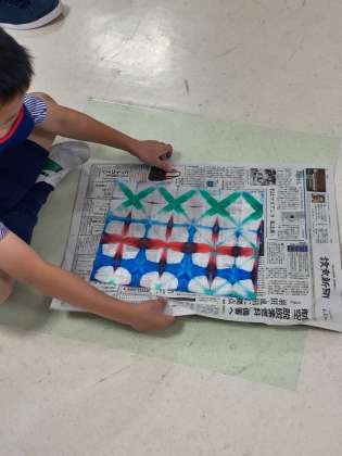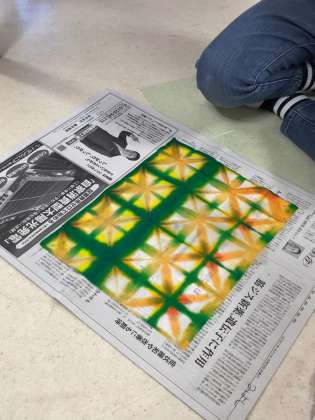 和紙を三角形に折り、自分好みの色の付いた液に三角形の3つの端を浸すと、みるみるうちに和紙が液を吸っていきます。新聞紙の間に挟んでギューとしぼり、しっかり水分を浸み込ませたら完成。