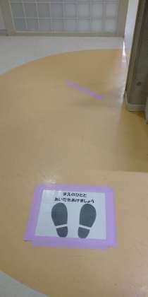 また、密を避けるために、間隔をあけるための目印を付け、人との距離をとって感染防止に努めています。