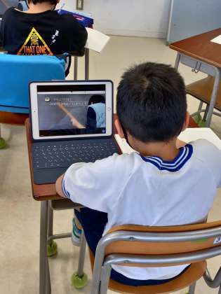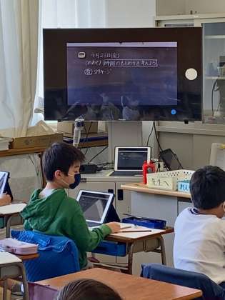 算数の授業の最初には、朝の時間に学習した方法でZOOMに入室し、他の教室にいる先生が書いた黒板の字をノートに書くことをやってみました。子供たちは自分のiPadの画面を見ながら、先生が書いた授業のめあてをノートにしっかり書くことができました。