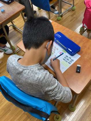 子供たちは「9」の字を丁寧に書いていました。気を付ける点は、書き順、字の大きさ、バランスなど、いくつかあります。字形を整えるためにも、お手本の字を見ながら繰り返し書いて練習するといいですね。