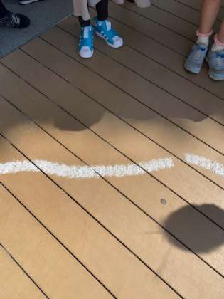 白い線が引いてあるのが10分前の「かげ」の位置。他の場所に行って帰ってくると・・・。「10分でもこんなに、かげの位置が変わるんだ」と子供たちの声。先生から「3時間目にこのかげがどうなっているのか予想してみよう」との声かけがあり、子供たちは学習への意欲がかき立てられた様子でした。