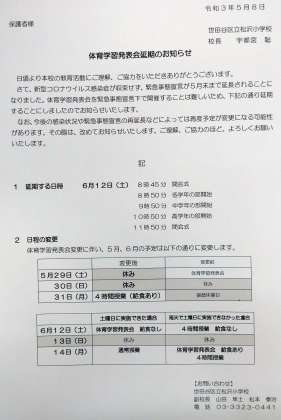 体育学習発表会を緊急事態宣言下で開催することは難しいため、6月12日(土)に延期することにしました。