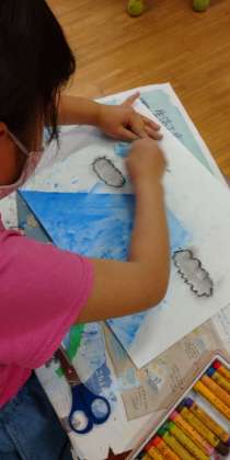クレパスで色をつけたあと、ぼかしたいところをティッシュでこすります。
