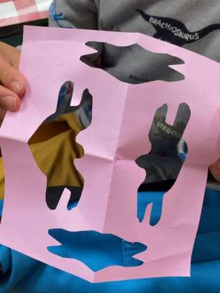 1年生が折り紙を使って、素敵な模様を作っていました。新しい折り方や切り方に挑戦する子供たち。折り方や切り方が違うと、開いたときの模様も大きく変わってきます。最後に折り紙を開くときの子供たちの顔がいいですね。「どんな模様になるのか」ワクワクドキドキの瞬間がそこにはありました。