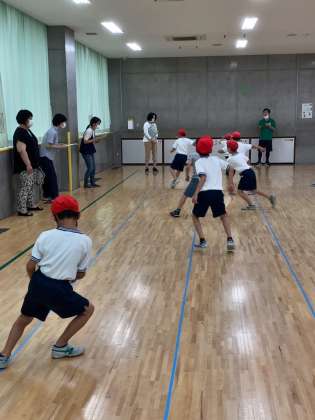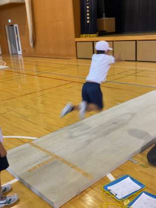 2年生が体育館と小アリーナに分かれて、立ち幅跳びと反復横跳びを行いました。反復横跳びでは20秒という短い時間でサイドステップを繰り返す子供たち。シャトルラン同様、保護者ボランティアの方々にお手伝いいただいたので、スムーズに測定を行うことができました。