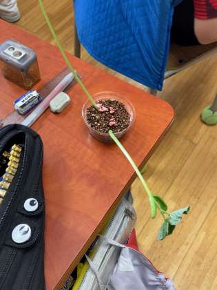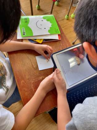 インゲンマメの種子の中がどのようになっているのか予想して、実際に種を半分に切って、種子の中を観察しました。観察の後にはiPadを使って動画を撮り、友達と共有する姿が見られました。