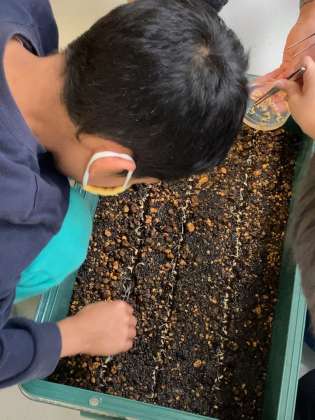 まずは種もみの観察から。子供たちは大型モニターに拡大して映された種もみを見ながらスケッチをし、色・形・大きさ・におい・触り心地などに着目し、注意深く観察していました。観察後には種もみをまくことができ、子供たちはとても嬉しそうでした。元気で丈夫なイネが育つといいですね。