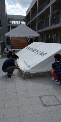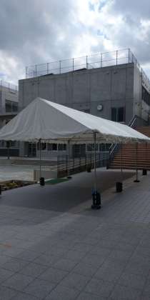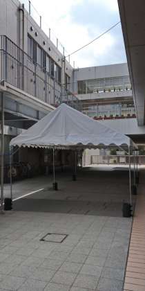 昨年は大階段下に設置していましたが、度重なる強風により痛んでしまったため、新たにテントを購入し、保健室前と大階段前に設置しました。