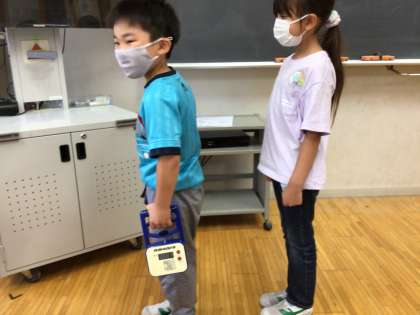 体力テストの握力の測定を教室で行いました。初めての握力計に、順番を待っている間ワクワクしている様子でした。握力計をしっかり持ち、「ふんっ!!」と力いっぱい握りました。