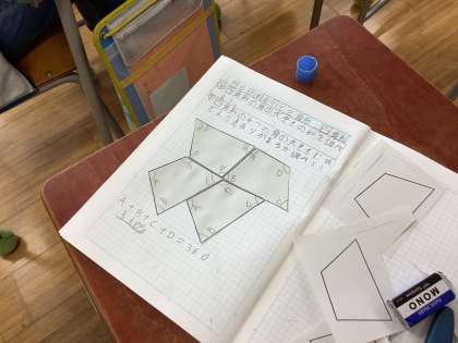 6/10 算数「合同と三角形、四角形」 5年生 公開日 2021/06/10 更新日 2021/06/10 できごと 四角形の4つの角の大きさの和を調べました。 そこからどのような決まりがあるか考え、皆でアイデアを伝え合いました。 いいね(0)