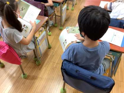「形が書いてあるね。」「使い方はここだよね。」「おうむの餌は、実だ。」とサイドラインを見せながら、友達と交流しました。