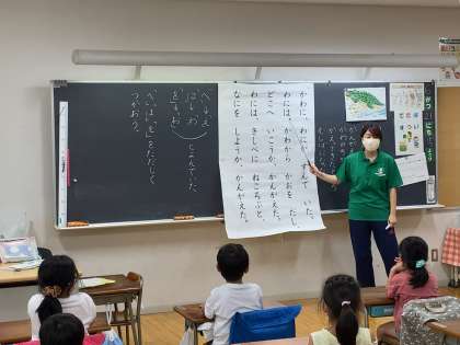 わにの唱え歌を聞いたり、読んだりしながら、「は」「を」「へ」の正しい使い方を学習しました。まずは先生が読みます。先生が唱え歌を読み始めると、子供たちから「違う!」の声が。よく聞いている子は先生の間違いにすぐに気付きます。先生はどんどん(わざと)間違えることで子供たちの気付きを引き出していました。